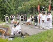 草生水まつりで、わき出る原油をつぼに取る採油式=市内西山町妙法寺の献上場 (2008/08/25)