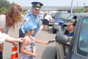 交通安全レターを配り、事故防止を呼びかける園児ら=市内両田尻の国道252号 (2008/07/23)
