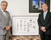 御製の歌の書を刈羽村に贈った白倉南寉さん(右)=村役場 (2008/06/20)