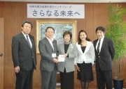 義援金を会田市長に手渡すペギー葉山さん(右から3人目)ら=27日午前、市役所市長応接室 (2008/06/27)