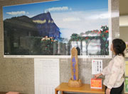 峨眉山の写真とともに四川大地震の募金箱を設置した市高柳町事務所 (2008/05/20)
