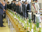 県酒造従業員組合連合会総会で、品評会上位入賞酒が並んだ利き酒=産文会館 (2008/05/21)