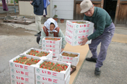市内下大新田で、早朝に摘み取ったイチゴを集め、市場へ出荷する作業 (2008/05/23)