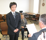 松縄武彦・柏専学院理事長から産大専任教員の辞令を受ける蓮池薫さん (2008/04/02)