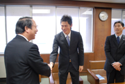 会田市長から激励を受ける五輪出場内定の富沢慎選手(中央) (2008/02/26)