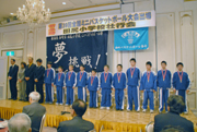 全国出場へ「夢 挑戦」と書かれた応援旗の前で抱負を語る田尻小ミニバスの選手 (2008/02/29)