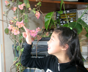 外の雪景色とは対照的に、店内には南国の花・ブーゲンビリア=市内松波1の理容店 (2008/01/21)