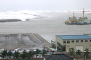 強風で大きな波しぶきが防波堤を洗う柏崎港=24日午前、市内番神2の高台から (2008/01/24)