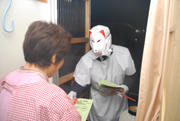 仮設住宅を訪問し、狐の装束で110番の適切な利用を呼び掛ける柏崎署員=9日 (2008/01/10)