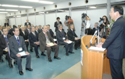 市の幹部職員に年頭のあいさつを行う会田市長=4日、市役所大会議室 (2008/01/04)