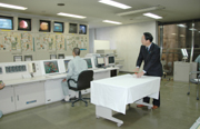 仮設煙突によるごみの焼却再開で設備のスイッチを押す会田市長=クリーンセンター (2007/11/15)