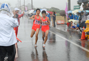 柏崎刈羽中学校駅伝で、激しい雨の中、たすきをつなぐ男子の刈羽A=刈羽村役場前 (2007/09/29)