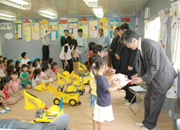 半田保育園の仮設園舎引き渡し式でお礼の小物入れを贈る園児たち (2007/09/18)