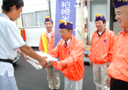 ライオンズ会員から柏崎産コシヒカリの新米を贈られる入居者(左)=荒浜運動広場の仮設住宅 (2007/09/25)