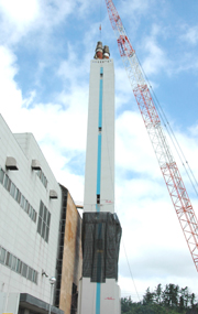 解体工事が始まったクリーンセンターかしわざきの煙突。まず内部の洗浄作業=5日 (2007/09/05)