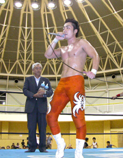 プロレスの試合後、村に募金を送り、復興を呼び掛ける安沢さん=刈羽村ラピカ (2007/09/12)
