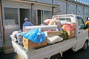 入居が決まった応急仮設住宅に家財道具を運び込む利用者=13日、市内駅前1の駅前ふれあい広場 (2007/08/13)
