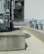 火災があった柏崎刈羽原発3号機所内変圧器。防油堤底面の亀裂があらわ=15日 (2007/08/16)