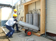 仮設住宅にプロパン容器の設置作業を行う県エルピーガス協会の事業者=市内椎谷 (2007/08/21)