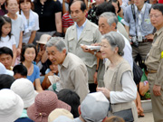 出迎えた大勢の市民らに、腰をかがめて言葉をかける天皇陛下と皇后陛下=柏崎小児童玄関前 (2007/08/08)