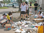 全国から届いた食器を並べ、被災者に無償で配る柏総の生徒たち=10日、同校玄関前 (2007/08/10)