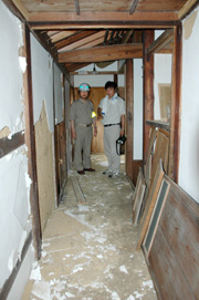 中越沖地震で大きな被害を受けた飯塚邸。被害の程度を聞く会田市長(左) (2007/08/12)