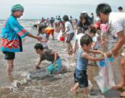 石地の海開きイベントでアサリ拾いを楽しむ家族連れ (2007/07/03)
