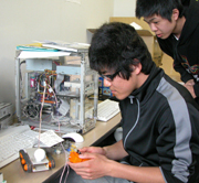 リモコンロボット自動車の試作機を確かめる工科大生 (2007/05/17)