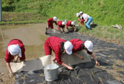 山の子米作りで、折りたたんだ紙マルチを広げながらコシヒカリの苗を植える門出小児童 (2007/05/23)