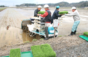 8月末の収穫・出荷を目指した早期栽培越路早生の田植え作業=22日、市内畔屋 (2007/04/23)