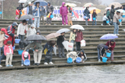 雨の中、サケの稚魚を放流する家族連れ=柏崎さけのふるさと公園 (2007/04/02)
