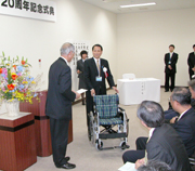 設立20周年で市に車いすを贈るKASIXの小林社長(左端は若山副市長) (2007/04/03)