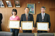 鉄道活性化コンペで最優秀賞の小林さん(中央)と、夢ひろがる柏崎賞の九里さん(左)、田辺さん(右)=市役所・議会議長応接室 (2007/02/24)