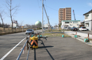 工事再開で変形道路が解消される駅前公園前の市道 (2007/02/17)