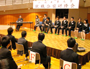 産大の就職合宿研修会。壇上の4年生、卒業生と質疑を交わす3年生 (2007/02/05)