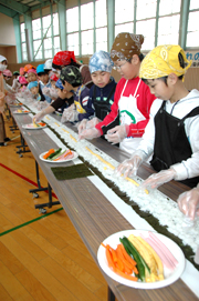 長い太巻きにチャレンジする小学生たち=比角コミセン (2007/02/06)