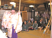 雪なしの境内の的に祈願の矢を放った二田物部神社の弓始 (2007/02/08)