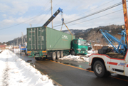 道路をふさいだ大型トレーラーの撤去作業=16日午前、市内石曽根の国道252号 (2007/01/16)