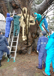 新年に期待を込めた大ケヤキへのしめ縄奉納=市内新道、鵜川神社 (2006/12/18)