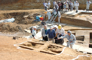 軽井川南遺跡群中の千刈C遺跡・西地区で「ふいご座」を確認し、説明を聴く人たち (2006/10/30)