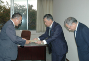 松縄武彦・柏専学院理事長に要望書を手渡す「新潟産業大学を考える経済人の会」=30日 (2006/10/31)