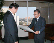 臨海学園への感謝状を会田市長に贈る東京恵明学園の曽田園長(右) (2006/11/08)