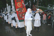 雨の中、漆島に向かって出発する狐の夜祭りの行列=市内高柳町栃ケ原 (2006/10/10)