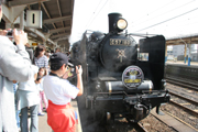 大勢の人が出迎える中、柏崎駅に到着した蒸気機関車=14日 (2006/10/14)