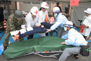 北条の防災訓練で、AEDを取り付けたけが人(人形)を救急車に運ぶ (2006/10/02)