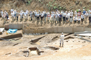 軽井川南遺跡群で発掘調査が進められる大善寺A遺跡で、学芸員の説明を聴く参加者 (2006/07/31)