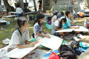 真夏の日差しを浴びながら、夏休み写生大会で絵筆を走らせる参加者=柏崎神社 (2006/08/05)