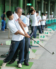 産大附属のゴルフ授業でフォームの指導を受ける生徒=5日、青山ゴルフ練習場 (2006/07/07)