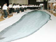 「クジラ博士の出張授業」で、クジラの実物大シートで大きさに驚く柏崎翔洋の生徒 (2006/07/11)