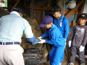 「ふるさと探検クラブ」活動で炭焼き窯から炭を運び出す鯖石小の児童 (2006/07/13)